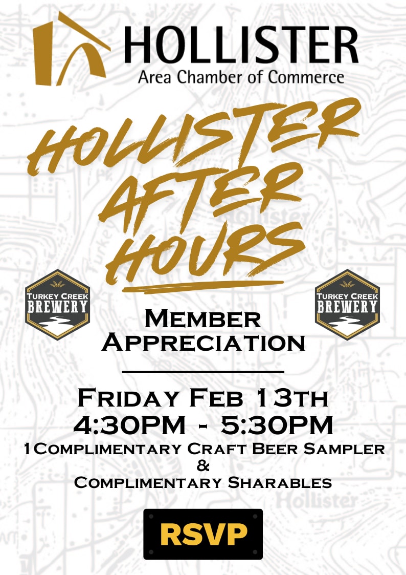 Join us for Hollister After Hours Friday February 13th from 4:30pm -5:30pm for networking, appetizers and amazing craft beer samples at Turkey Creek Brewery in Hollister, MO!