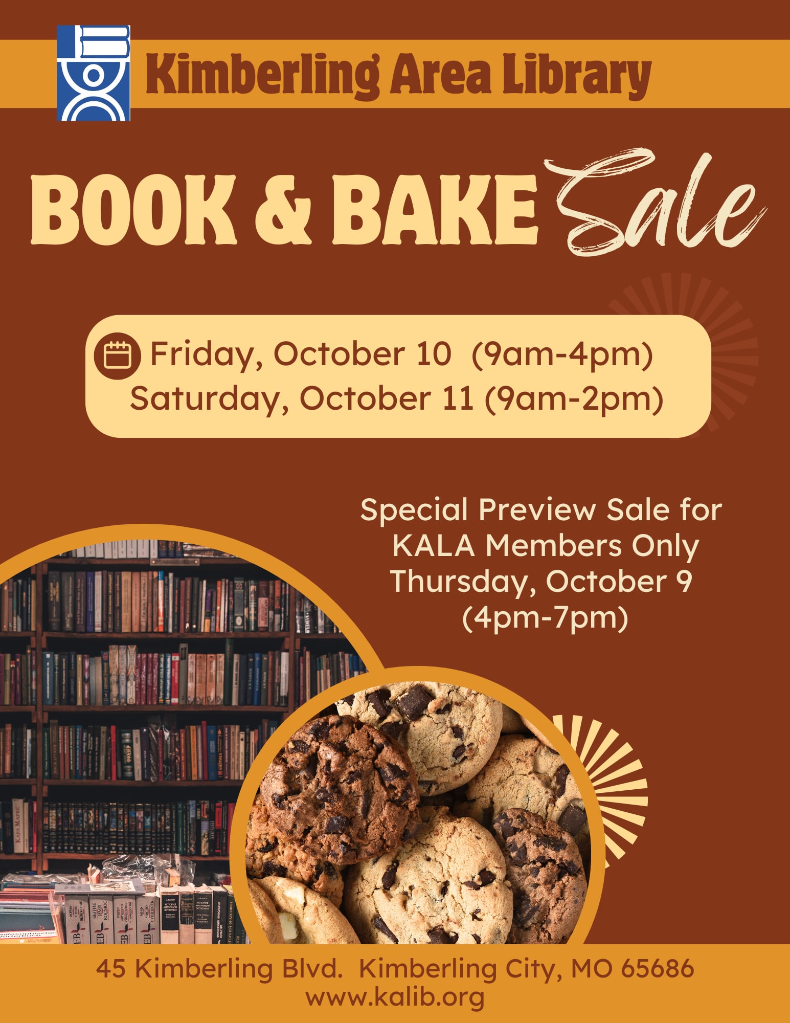 The Kimberling Area Library (KAL) will hold its annual fall book sale on Friday, October 10, 2025 from 9am to 4 pm and Saturday, October 11, 2025 from 9 am to 2 pm. There will be a special book pre-sale for KAL Association Members on Thursday, October 9, 2025 9 from 4 pm to 7 pm. There will be 1,000's of books for sale, including popular fiction, paperbacks, biographies, and lots of non-fiction category books. Puzzles, DVDs, children's books, and audiobooks will also be available. To accompany the book sale, a bake sale will also be held.Images